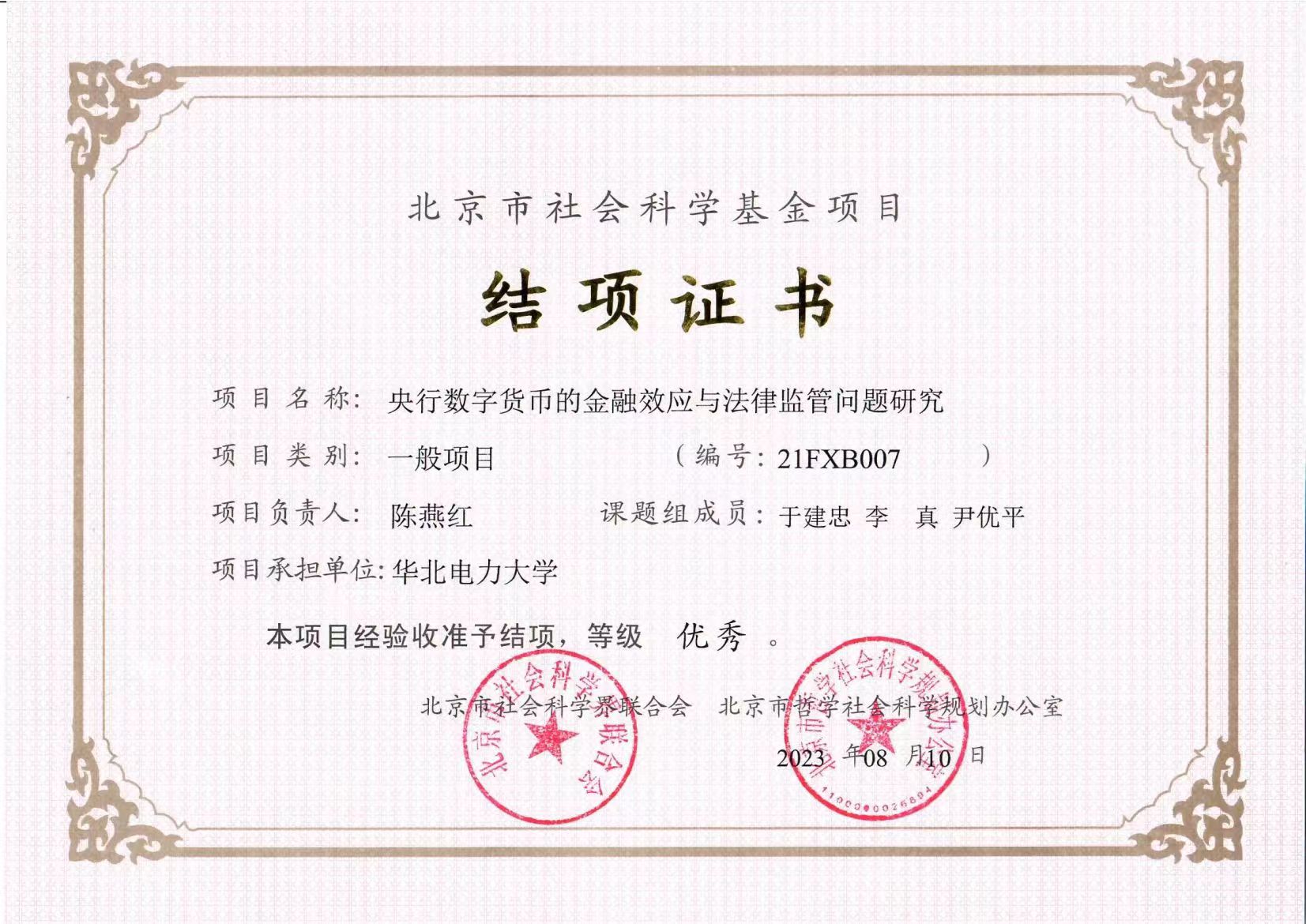 近日,公司陈燕红副教授主持,中国人民银行等单位成员参与的北京市社会科学基金项目“央行数字货币的金融效应与法律监管问题研究”(项目编号:21FXB007),经由北京市社会科学界联合会(简称北京市社科联)与北京市哲学社会科学规划办公室(简称北京市社科规划办)专家会议严格评议,顺利验收准予结项,并获评优秀等级。