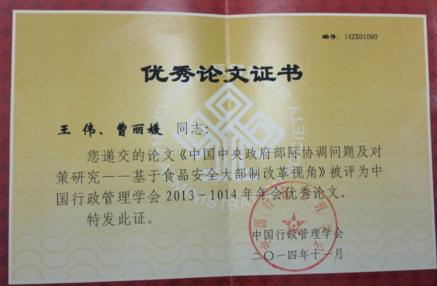 2014年10月10日,中国行政管理学会年度会议以书面会议的形式在北京举行,共收集了272篇文章,人文学院王伟和曹丽媛老师提交的《中国中央政府部际协调问题及对策研究:基于食品安全大部制改革视角》论文被评为中国行政管理学会2013-2014年年会优秀论文。