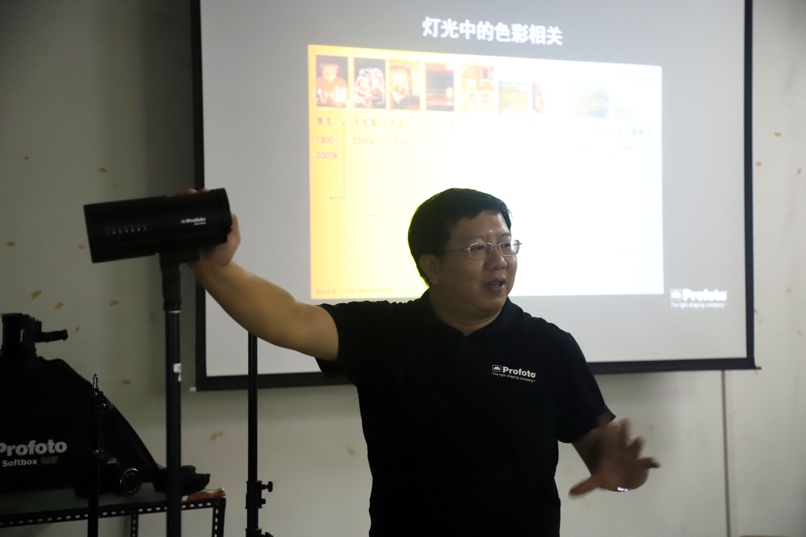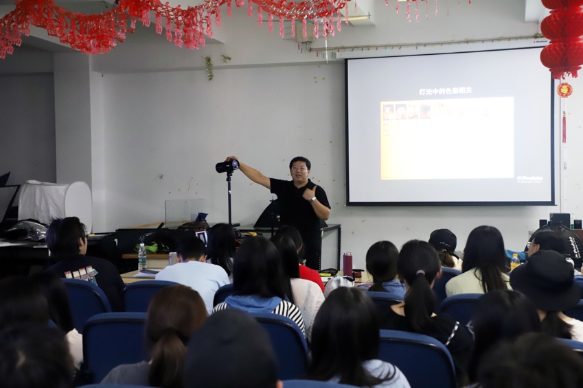 上午八点,课程准时开始,吉老师首先向同学了介绍了摄影所用的一些基本灯具及其附件,又强调了影棚拍摄的安全问题,包括但不限于用电安全、设备安全、支撑系统安全等。随后,光线基础知识成为了讲授的重点。从光三个参数即光的形状、传播特性、颜色,到光的三个基本要素即光源的距离、方向、形状,吉老师用丰富的ppt对比影像和实际操作案例向同学们生动展示不同情况下光源对被摄体的影响情况,将灯具加带不同附件下光效的微妙变化展现的淋漓尽致,使同学们直观感受到了布光艺术对于影像的神奇影响。最后,讲授完毕距离下课还有半个小时左右,吉老师和他的团队成员热情邀请所有同学上前体验其所带来的保富图灯具,许多同学纷纷上前询问操作,场面一片热闹。