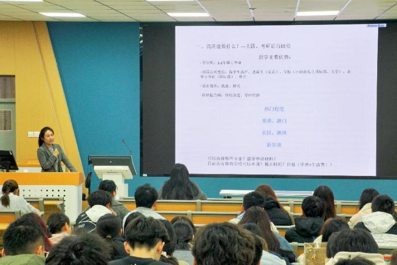 本次大会还邀请到了英国布里斯托大学国际关系硕士徐梦为大家介绍出国留学的深造途径。她详细介绍了出国留学的优势与各地区留学情况,与大家分享了大学三年应如何规划出国留学的道路,在每个学年都应做好相应的准备,并提醒同学们要保持一个好的GPA成绩,认真学好每一门专业课。