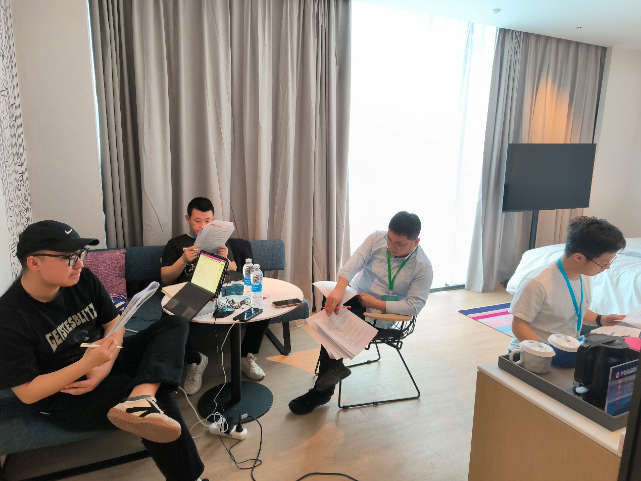 4月20日,陈建国教授、呼占平副教授和李娉副教授3人带队前往中国科学院大学参赛,指导组的其他成员在线上为参赛队伍出谋划策,加油打气。现场师生团队积极备战,系统分析双方案例内容,从理论创新性、适用性等角度展开深入讨论和筹备,呼占平老师更是与团队员工一起奋战到凌晨三点。