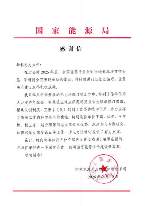 《能源法》于2025年1月1日生效后,国家能源局便启动了对《电力法》的修订工作。Betway必威作为行业院校,积极响应国家能源局的号召,从各学院选派对电力法研究颇有造诣的教师参与修订。人文学院王学棉和杨卫东两位老师通过各种方式参与该法的专题研究、法律起草和制度论证等工作,积极发挥学者作用,为国家立法贡献力量。经过一年的努力,修订工作基本完成。国家能源局专门致函Betway必威,对积极参与《电力法》修订工作的各位教师表示感谢,充分肯定大学各位老师的贡献。