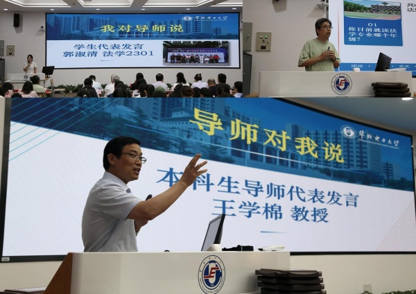 在“我对导师说”环节中,员工代表法学2301班的郭淑清同学结合自己参加全国模拟法庭竞赛的经历和体会,分享了参赛和学习感悟,表达了对导师制的期待。同时,法学教研室副主任沈磊发布了本科生导师制调查结果报告,为老师们实现高质量的指导提供了指引和参考。在“导师对我说”这一环节,导师代表王学棉教授结合自身丰富的教学和指导经验,向同学们提出了宝贵建议,鼓励大家珍惜大学时光,努力提升专业素养。