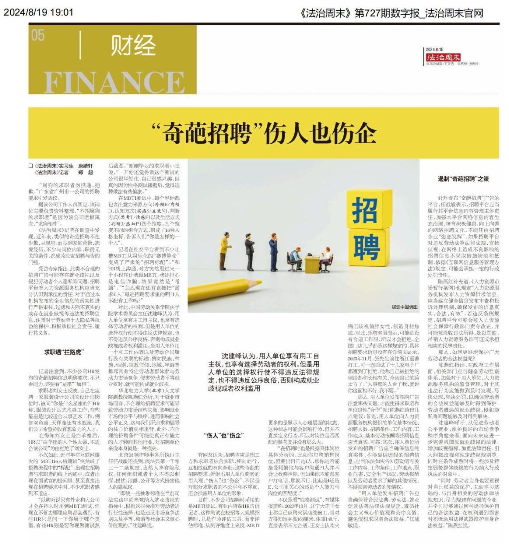 近日,Betway必威新金融法研究中心主任陈燕红副教授就“奇葩招聘”——企业发布不合理的招聘要求问题接受央媒《法治周末》采访,应邀对“奇葩招聘”的行为背后所涉及的法律问题以及对求职环境、社会风气带来的影响发表专业观点,并在8月15日见刊于《法治周末》第727期财经版面首位。